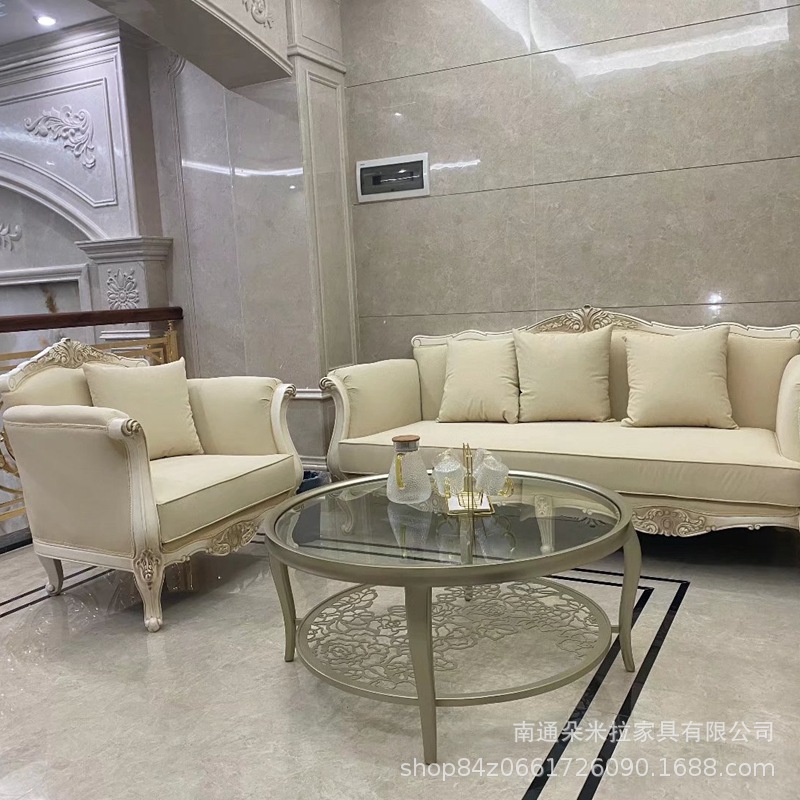 Sofa tempat duduk kayu padat gaya Eropa, tiga retro gaya Eropa, kursi sofa kain ruang tamu mewah ringan