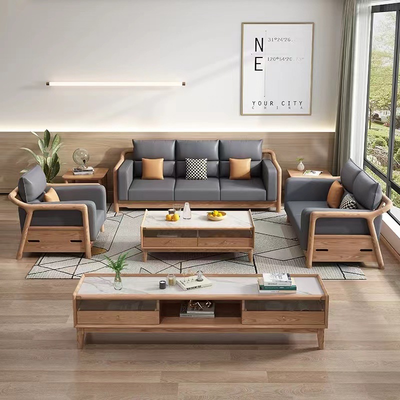 Nordic kombinasi sofa kayu padat apartemen besar furnitur ruang tamu modern minimalis furnitur kayu setelan sofa abu