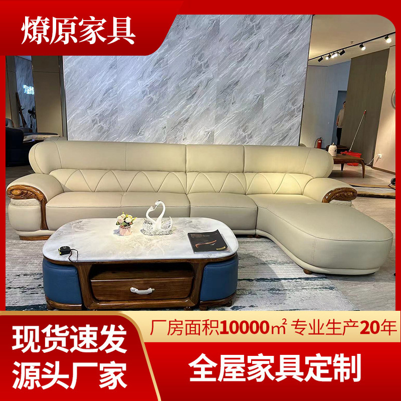 Sofa gaya eropa, bahan kulit kayu padat kombinasi 123, sofa kulit bentuk U kecil, ruang keluarga, furnitur vila amerika baru