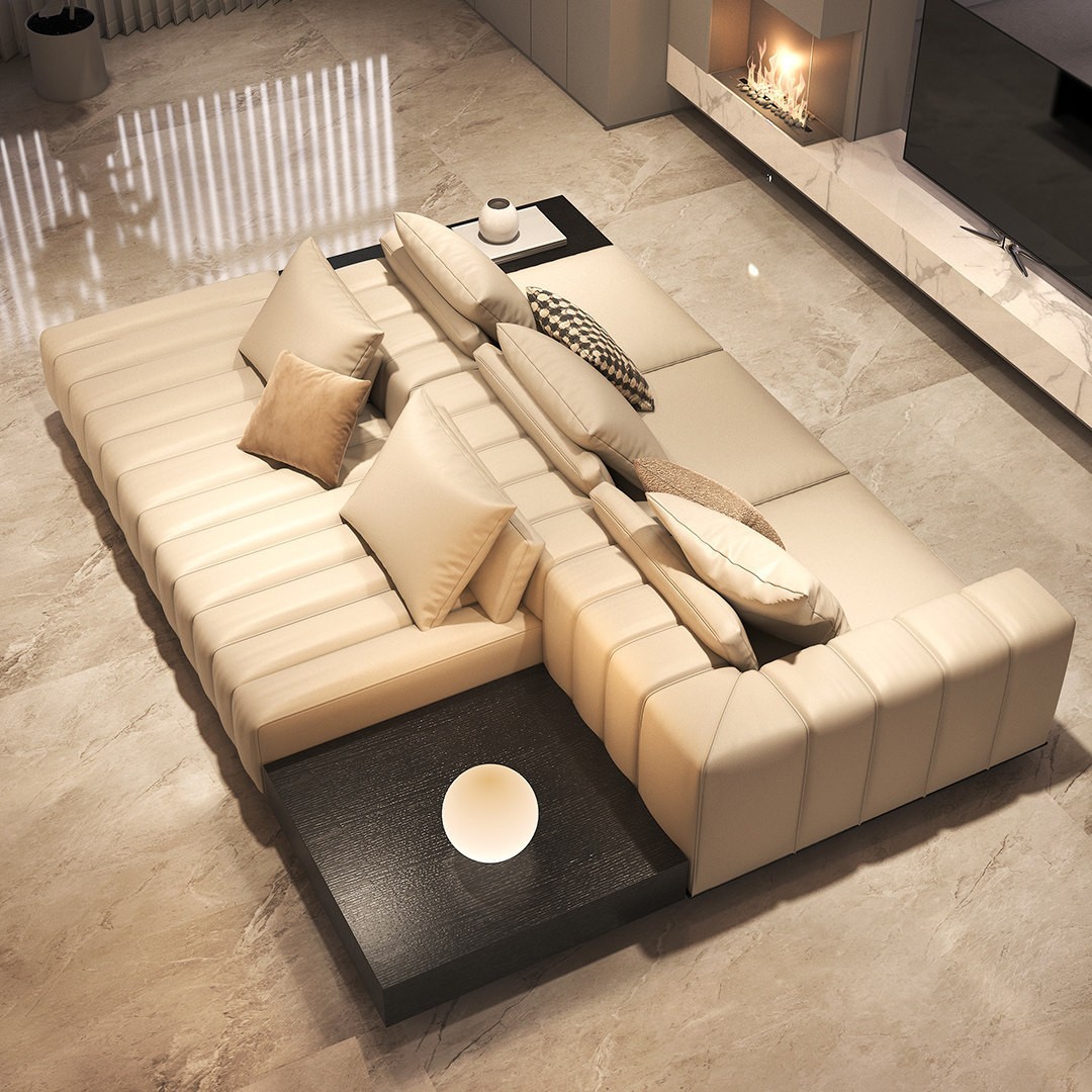 Sofa kulit kunci piano Italia, cahaya mewah gaya Italia ukuran ruang keluarga villa lantai datar ruang tamu kombinasi sudut Selir