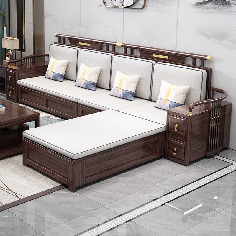 Sofa eboni gaya Cina baru sofa kayu solid furnitur ruang tamu apartemen kecil musim dingin dan musim panas kain penggunaan ganda sofa kayu