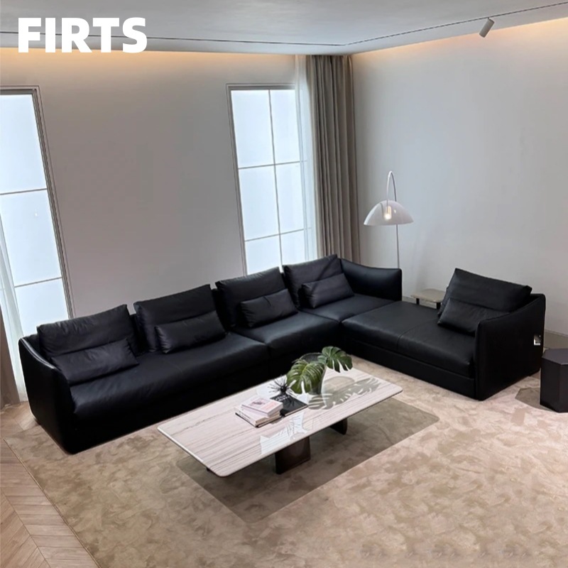 Sofa hutan mewah minimalis, sofa kulit Napa ruang tamu datar besar sudut lurus Hitam jazz Cahaya desainer
