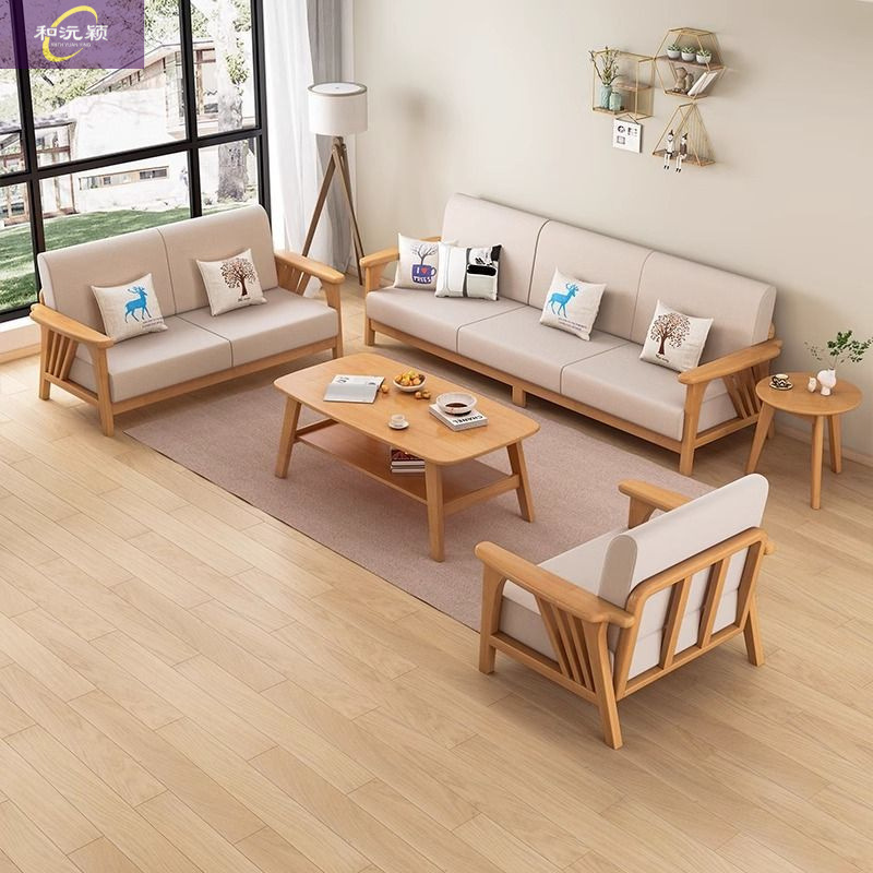Set Sofa Kayu Solid untuk Ruang Tamu Rumah Tangga Set Sofa Kain Kayu Warna Kayu Asli Tipe Kecil Sederhana Modern Nordik
