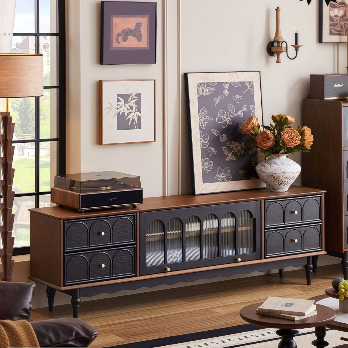 法式复古实木电视柜茶几客厅黑色落地储物柜美式网红收纳新款柜子