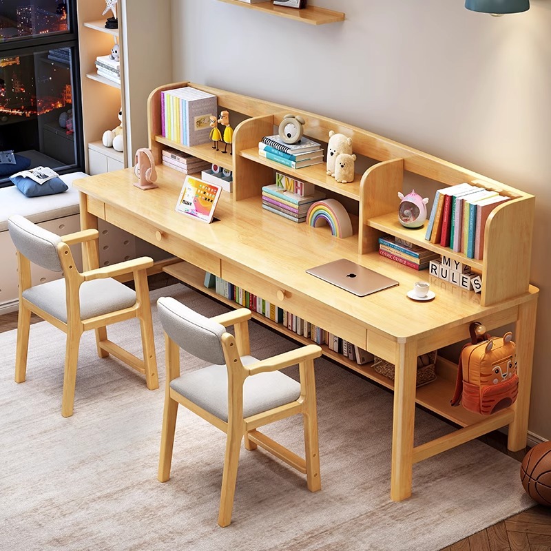Meja Kayu Solid Rak Buku Meja Panjang Siswa Sekolah Dasar dan Menengah Dua Orang Meja Belajar Kursi Meja Komputer Desktop Sederhana