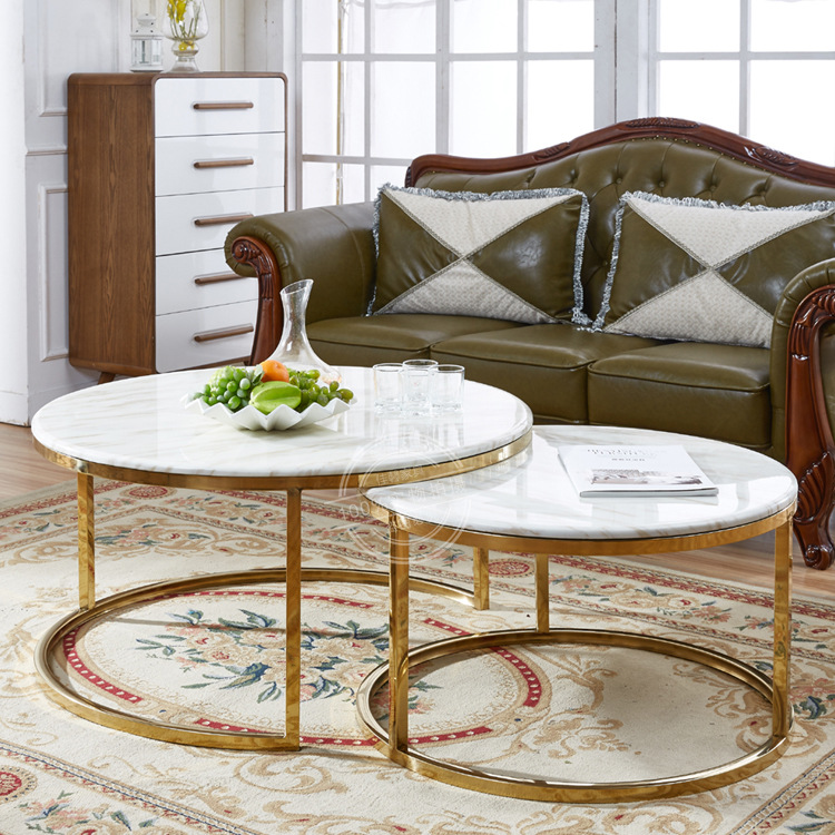 金色现代简约欧式风格大理石高低组合不锈钢圆形茶几一大一小茶桌