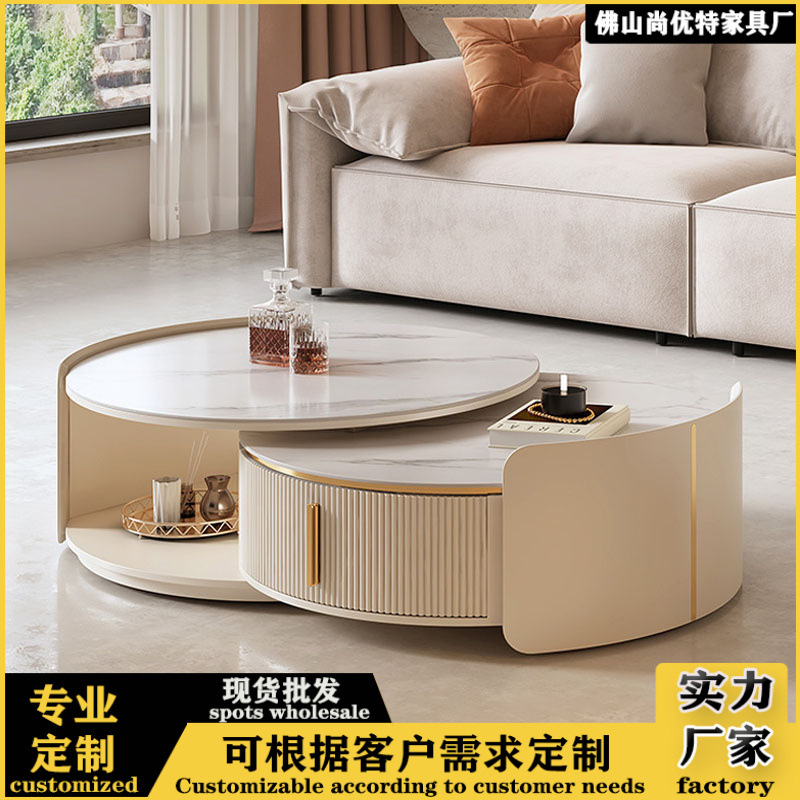 Meja kopi bulat mewah ringan, meja kopi putar gaya Krim Perancis, meja penyimpanan apartemen kecil modern