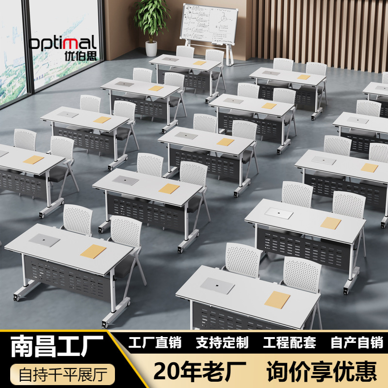 Meja pelatihan konferensi lipat, kombinasi meja dan kursi bergerak lembaga pendidikan ganda splicing meja panjang dengan roda