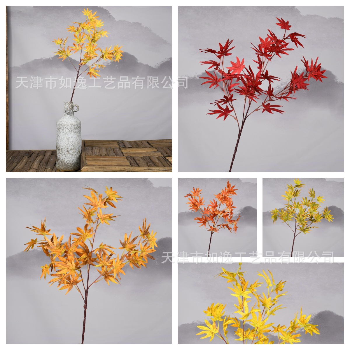 Tanaman lanskap teknik luar ruangan, dekorasi rumah tanaman hijau, daun Maple merah Xiangshan, cabang daun Maple 4 garpu buatan