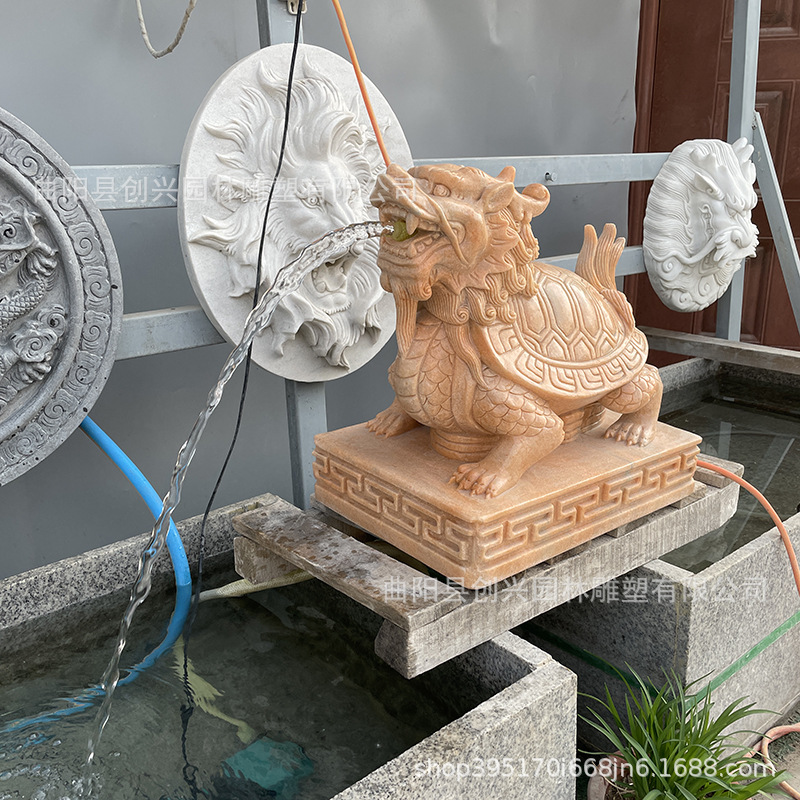 Batu ukiran naga kura-kura di bawah air mancur semprotan air naga lahir sembilan anak candi taman dekorasi lanskap matahari terbenam merah