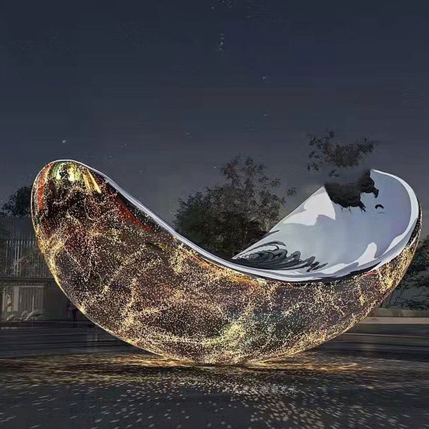 Kotak Patung Berongga Logam Besar Pemandangan Air Baja Putih Cermin Cahaya Stainless Steel Seni Patung Bulan