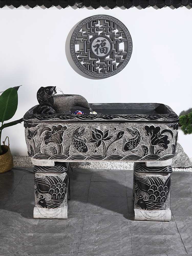Silinder Ukiran Batu Biru Antik Gaya Tiongkok Silinder Ikan Relief Teratai di Halaman Villa Silinder Pemandangan Air Luar Ruangan