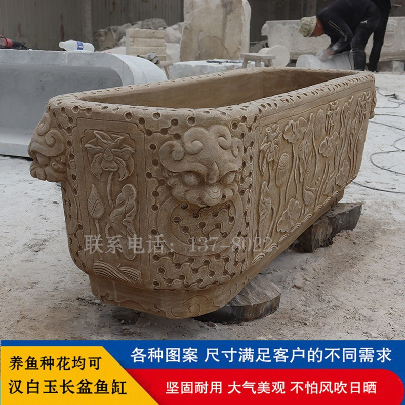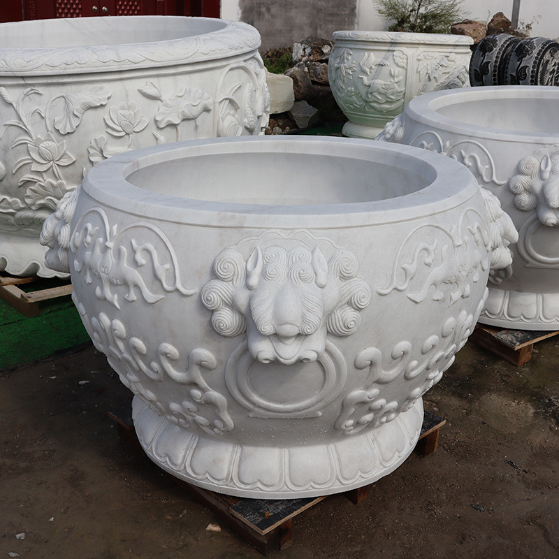 Batu marmer putih ukiran tangki ikan pot bunga batu bulat tangki air ikan pertanian bunga gaya Cina lanskap batu besar pintu tangki laut