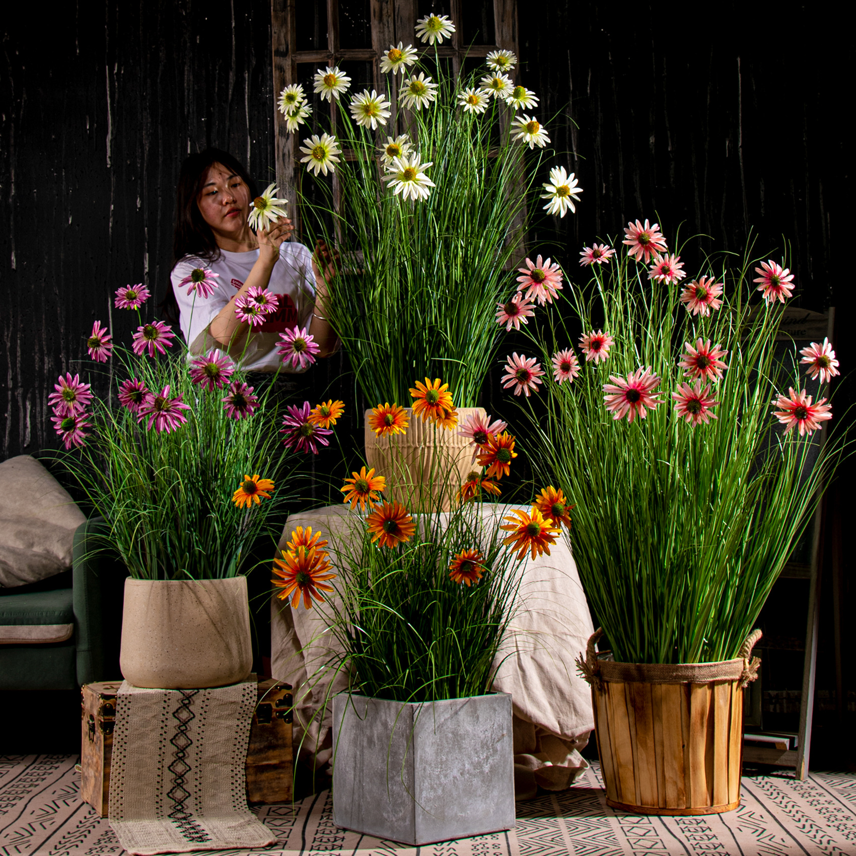 Bunga matahari buatan dalam ruangan simulasi bunga reed rumput pohon palsu tanaman pot bionik hijau menanam lanskap dekorasi