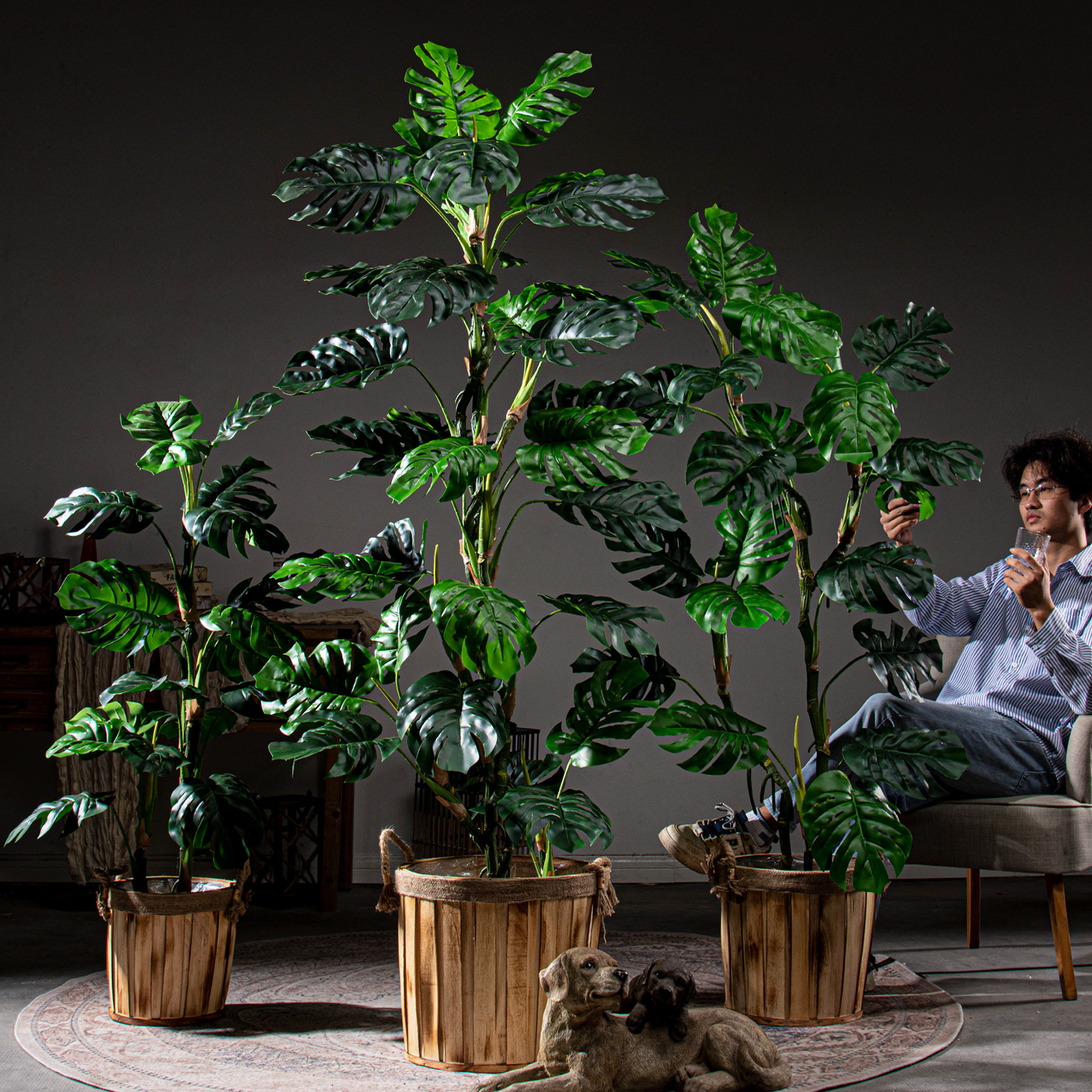 Tanaman buatan Monstera, pohon hijau buatan dalam ruangan ruang tamu pot besar bionik daun Monstera dekorasi lanskap