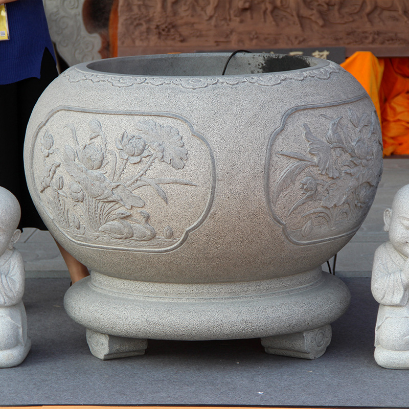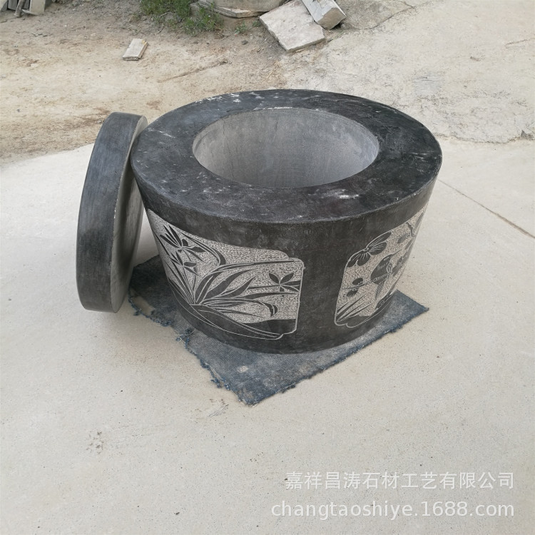 Batu Ukiran ikan teratai bulat silinder, halaman batu besar tangki air batu silinder gaya Cina batu baskom lanskap air pot bunga berlian imitasi tangki ikan antik