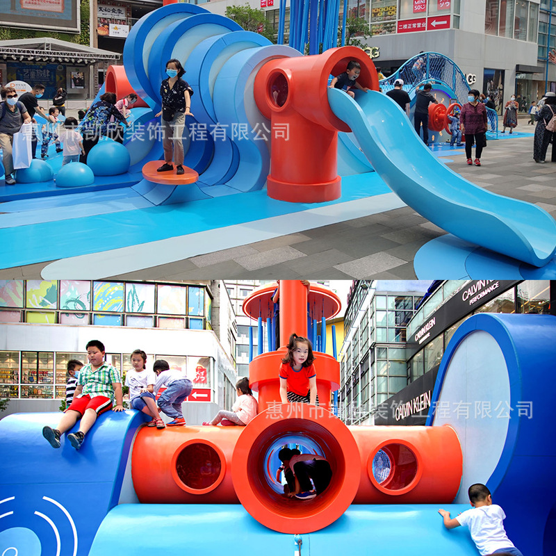 Pemandangan luar ruangan besar tema memanjat lubang geser sekolah FRP bangku berbentuk khusus paviliun persegi bingkai galeri patung