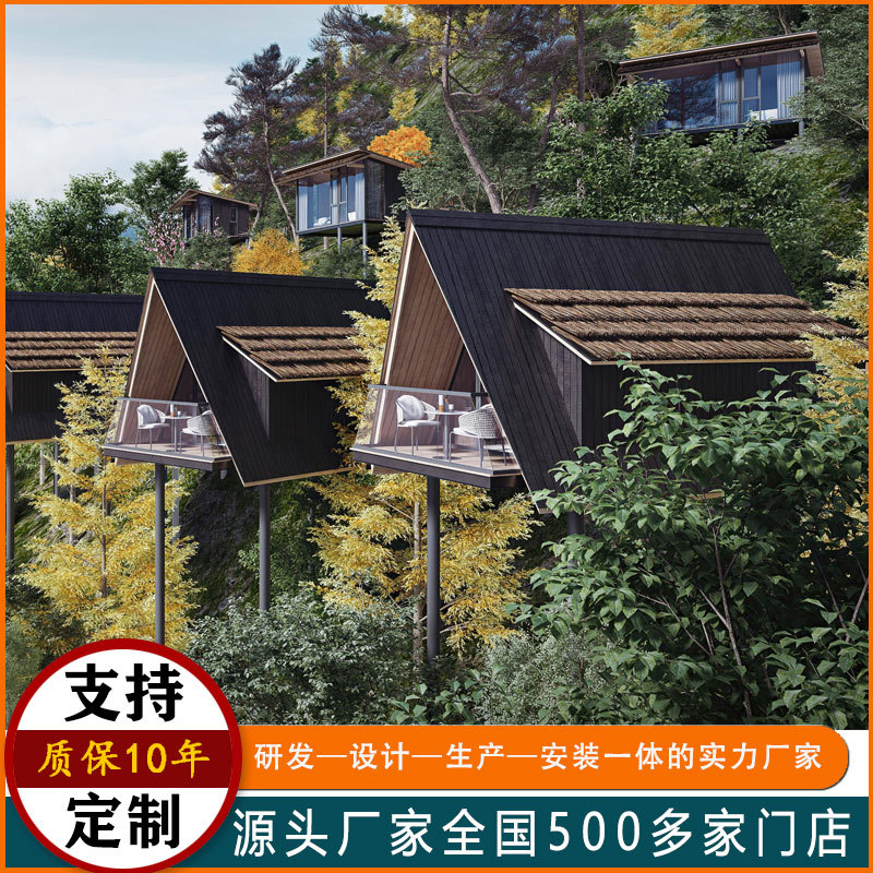 Desain rumah kayu kecil bergaya pedesaan dengan teras, rumah kayu segitiga, area pemandangan lanskap alam yang dapat disesuaikan.