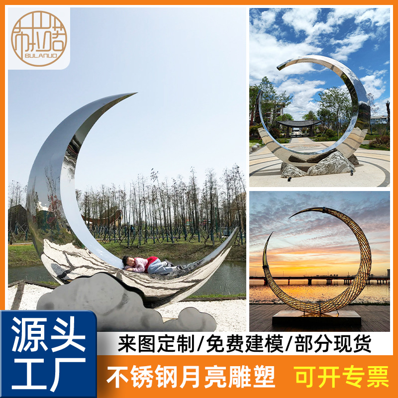 Lanskap besi tahan karat cincin bulan logam abstrak patung besar taman kota dekorasi pemandangan air bangunan real estate