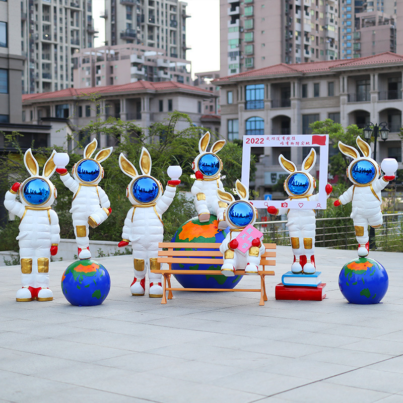 Kartun kelinci bercahaya luar ruangan FRP astronot patung taman lanskap dekorasi sketsa ruang ornamen kelinci