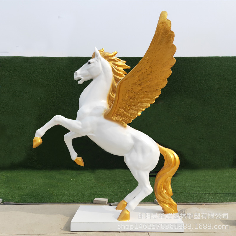 Patung Pegasus kaca serat fiber, hewan simulasi besar terbang model kuda putih, ornamen pemandangan luar ruangan taman hutan persegi