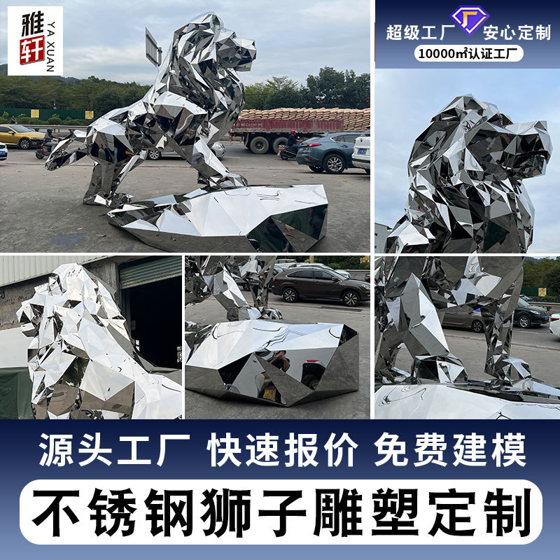 Besar Kustom Stainless Steel Hewan Singa Patung Cermin Geometri Karya Seni Lansekap Hotel Plaza Ornamen