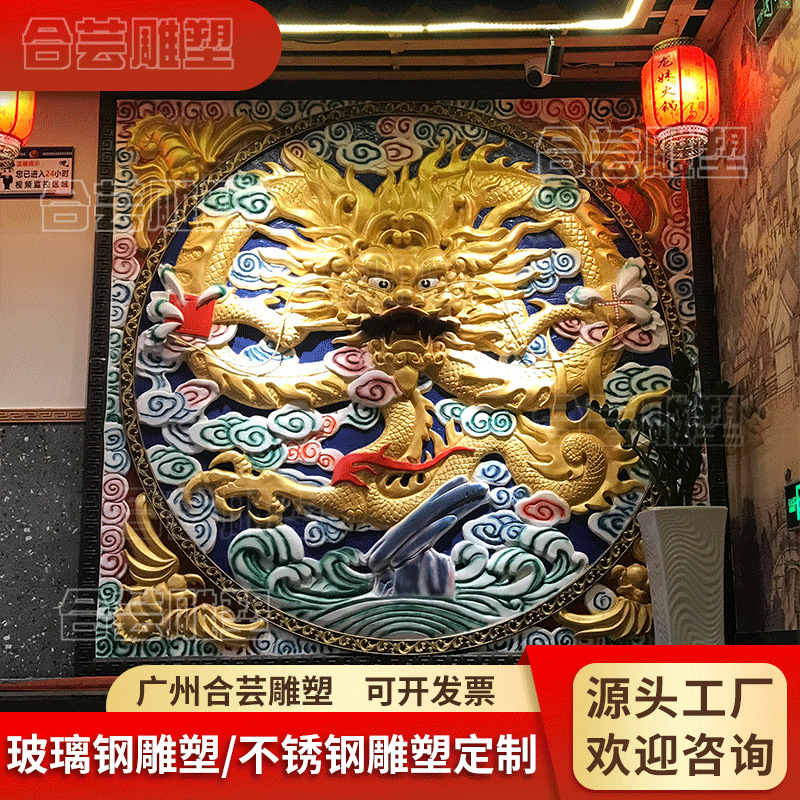 Patung Fiberglass relief besar karakter mural warna naga Cina latar belakang dinding Tentara Merah batu pasir Cina naga hewan