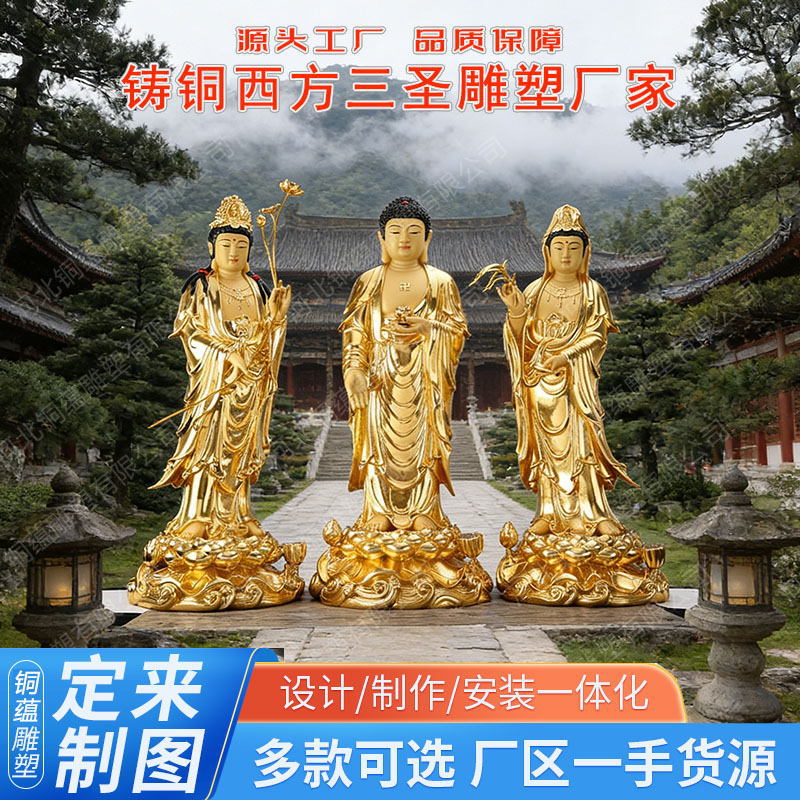 Patung Buddha kuningan Barat tiga tembaga suci patung berdiri pabrik Patung Guanyin kuil serat kaca patung Buddha Barat tiga patung tembaga suci