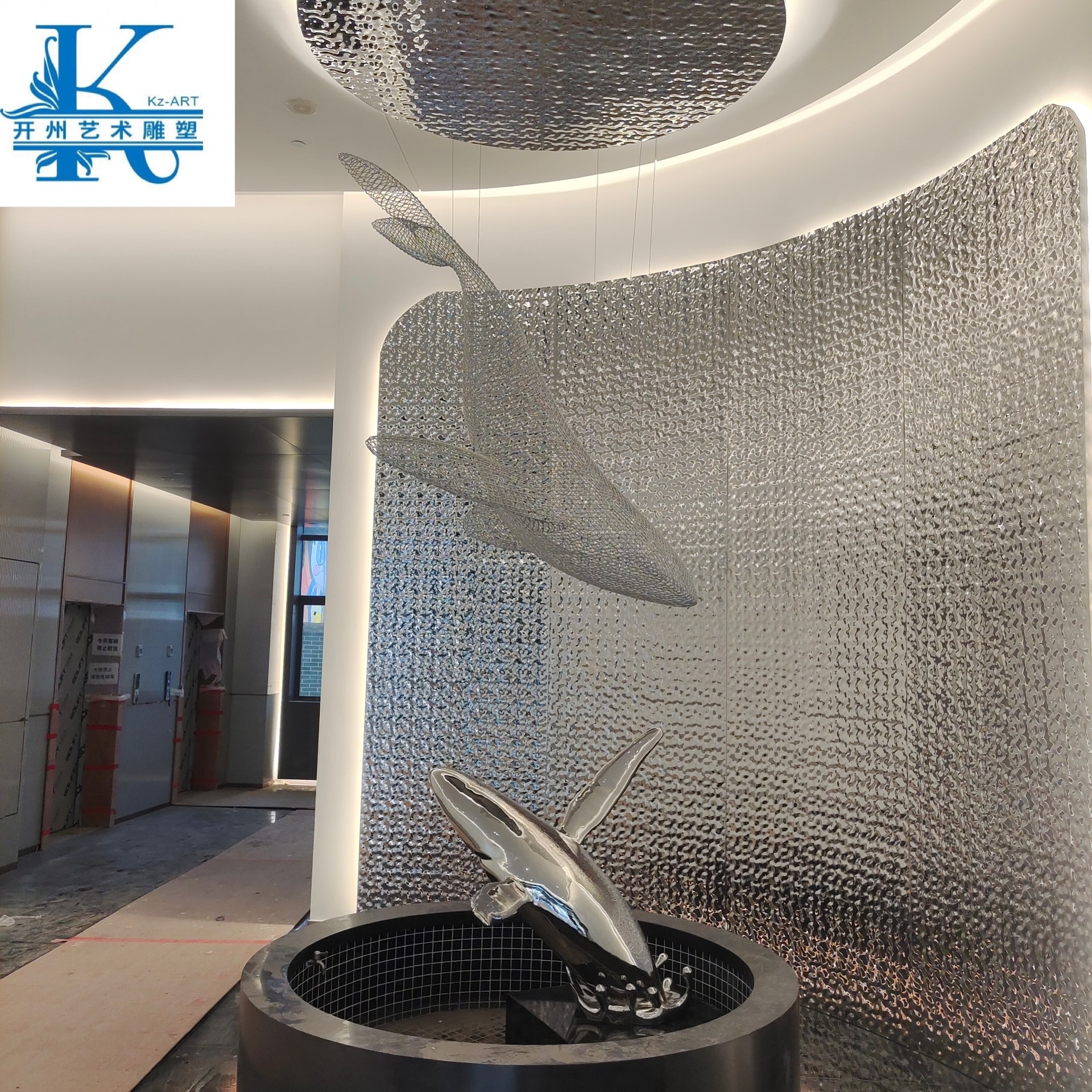 Patung lantai paus Stainless steel penjualan liontin udara kantor perangkat seni lobi kawat berduri paus berongga