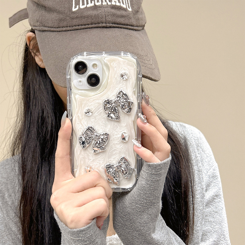 电镀银边蝴蝶结樱桃适用iphone16Promax苹果15手机壳13滴胶14少女