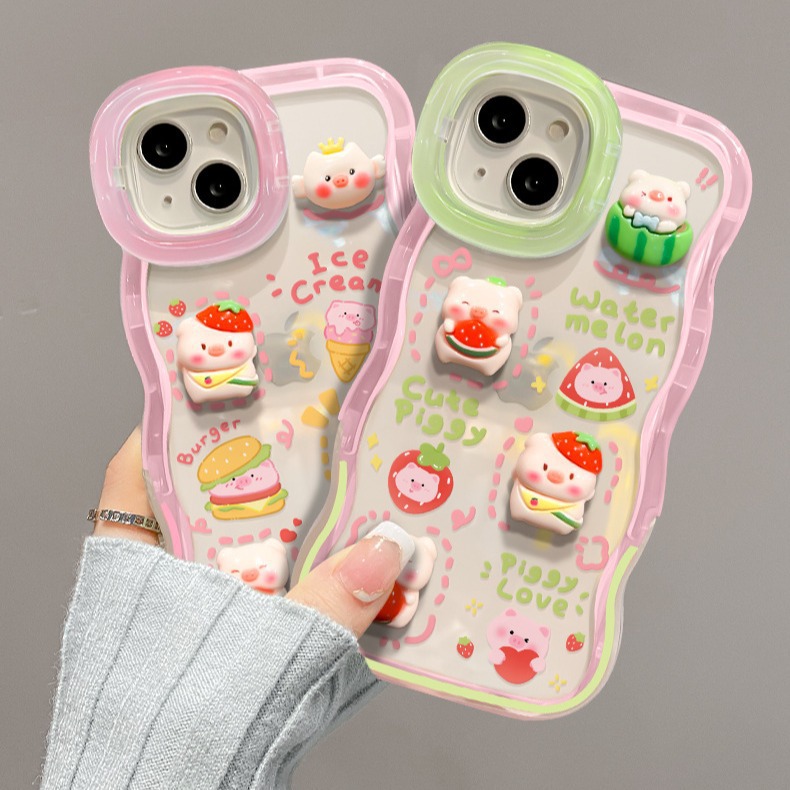 Casing Ponsel Cocok untuk Apple 15 16Promax Boneka Babi Lucu 12 Tepi Gelombang 14 Penyangga Ganda 11 Anti Jatuh 13