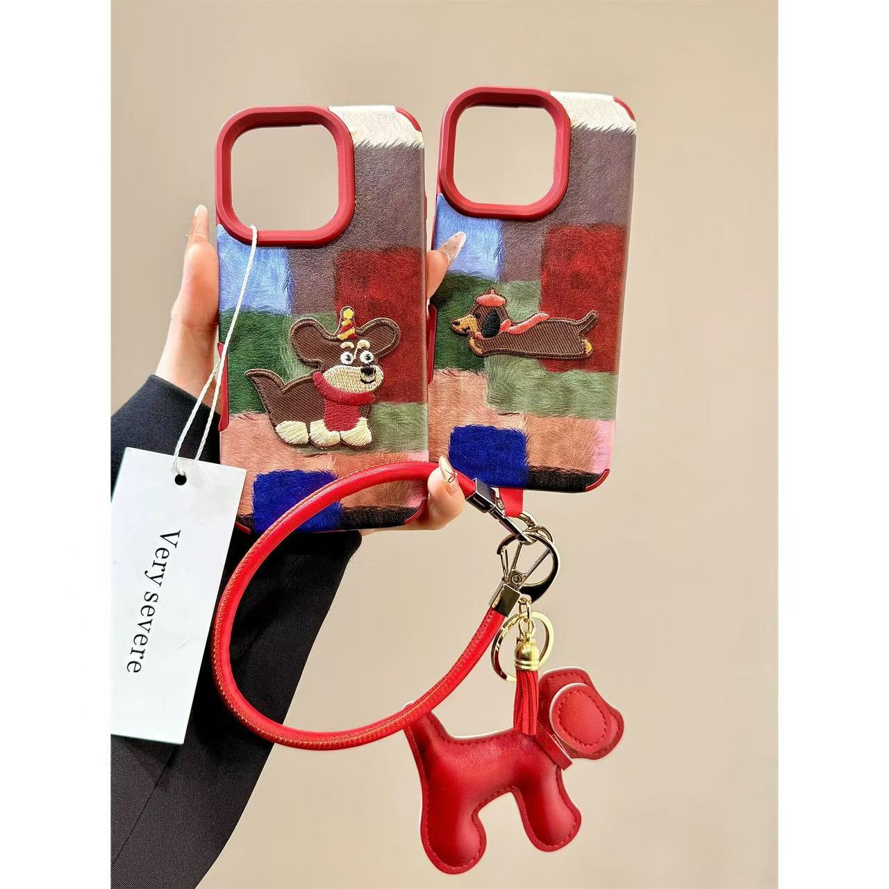 可爱色块刺绣狗狗手拎绳适用苹果16promax苹果15手机壳14新款13软