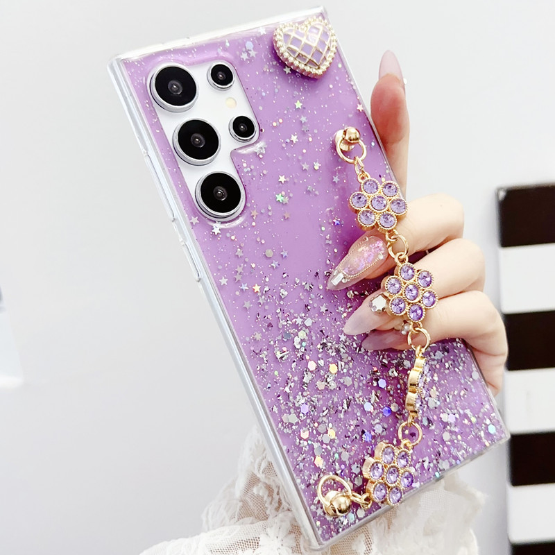 Cocok untuk casing ponsel Samsung S24 Ultra, gelang S23, resin S22, glitter Note 20, niche A54 hati A16.