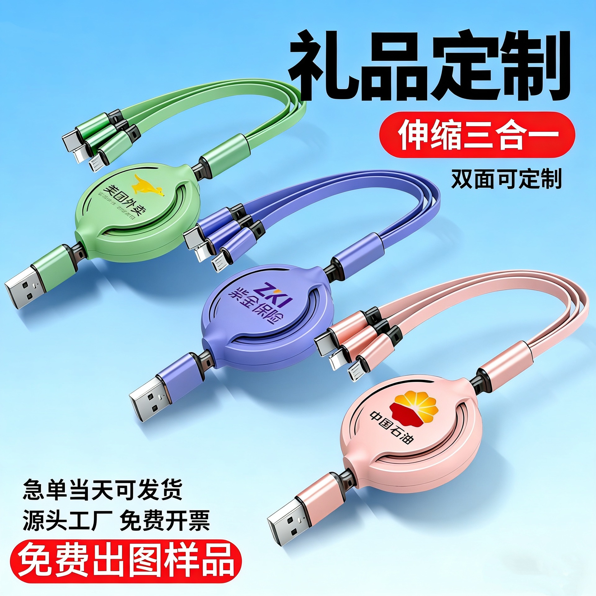 Kabel pengisi daya tiga dalam satu hadiah iklan logo kabel data dapat ditarik satu ke tiga kabel pengisi daya ponsel multifungsi