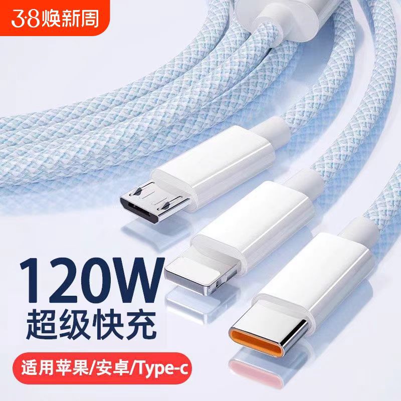 66W Kabel Data Super Cepat Tenun Satu Seret Tiga Kabel Data untuk Huawei Apple Kabel Pengisi Listrik Kabel Data Ponsel Cepat