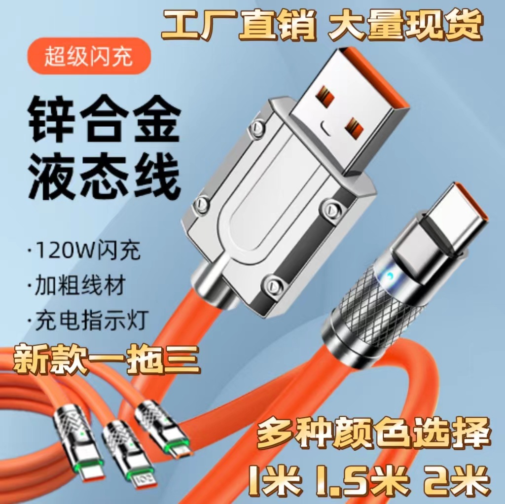 Kabel pengisi daya super cepat paduan seng garis pelanggan mesin cocok untuk ponsel Android Apple Huawei silikon satu tarikan tiga