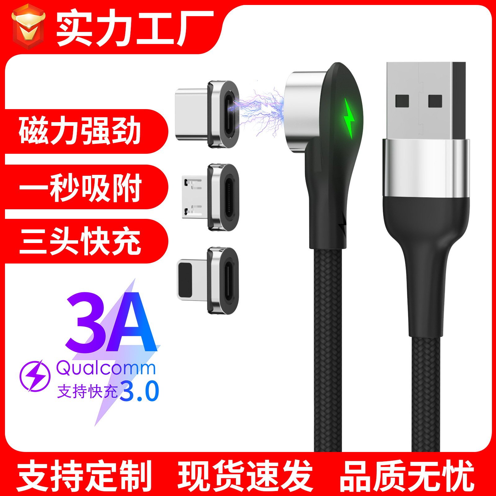 Kabel pengisi daya ponsel, 3A siku magnetik kabel data untuk Apple Huawei TypeC pengisian cepat satu tarik tiga USB jalinan kabel pengisian daya ponsel