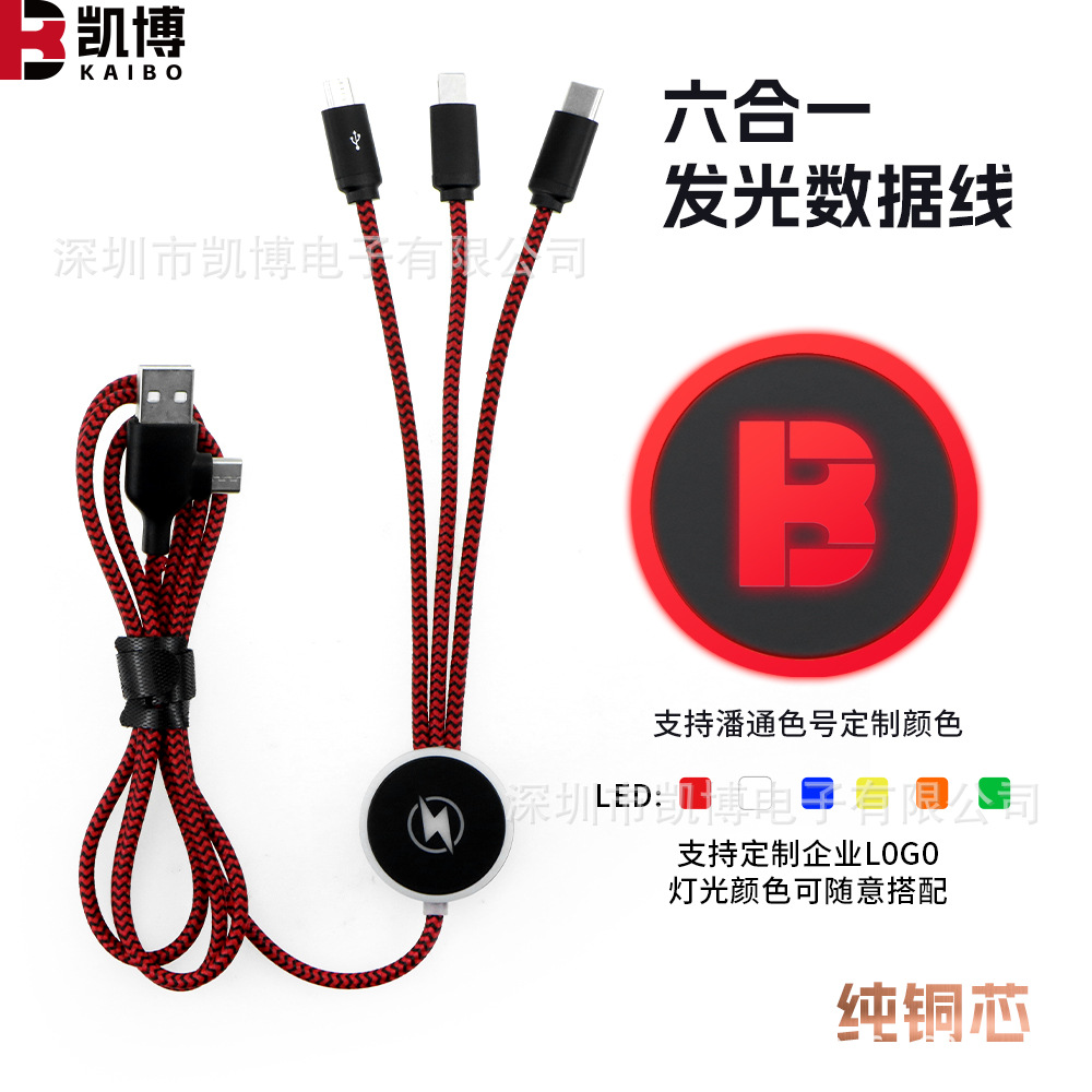 Kabel data ponsel bercahaya LOGO enam dalam satu, kabel pengisian logo transparan LED tenun tiga multifungsi