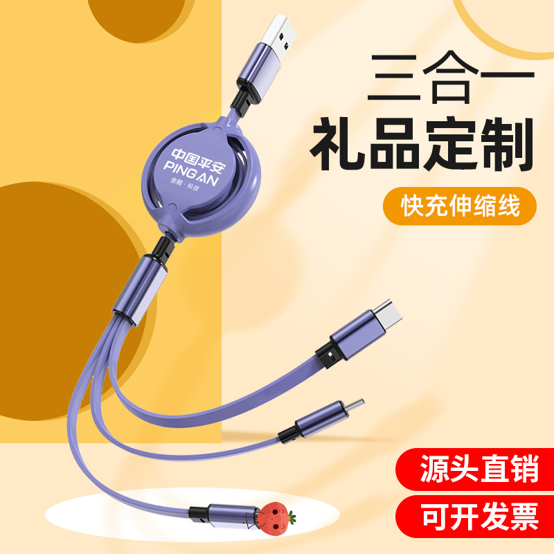 Kabel data tiga dalam satu, kabel macaron tiga dalam satu hadiah logo kustom pengisian daya cepat ponsel dapat ditarik