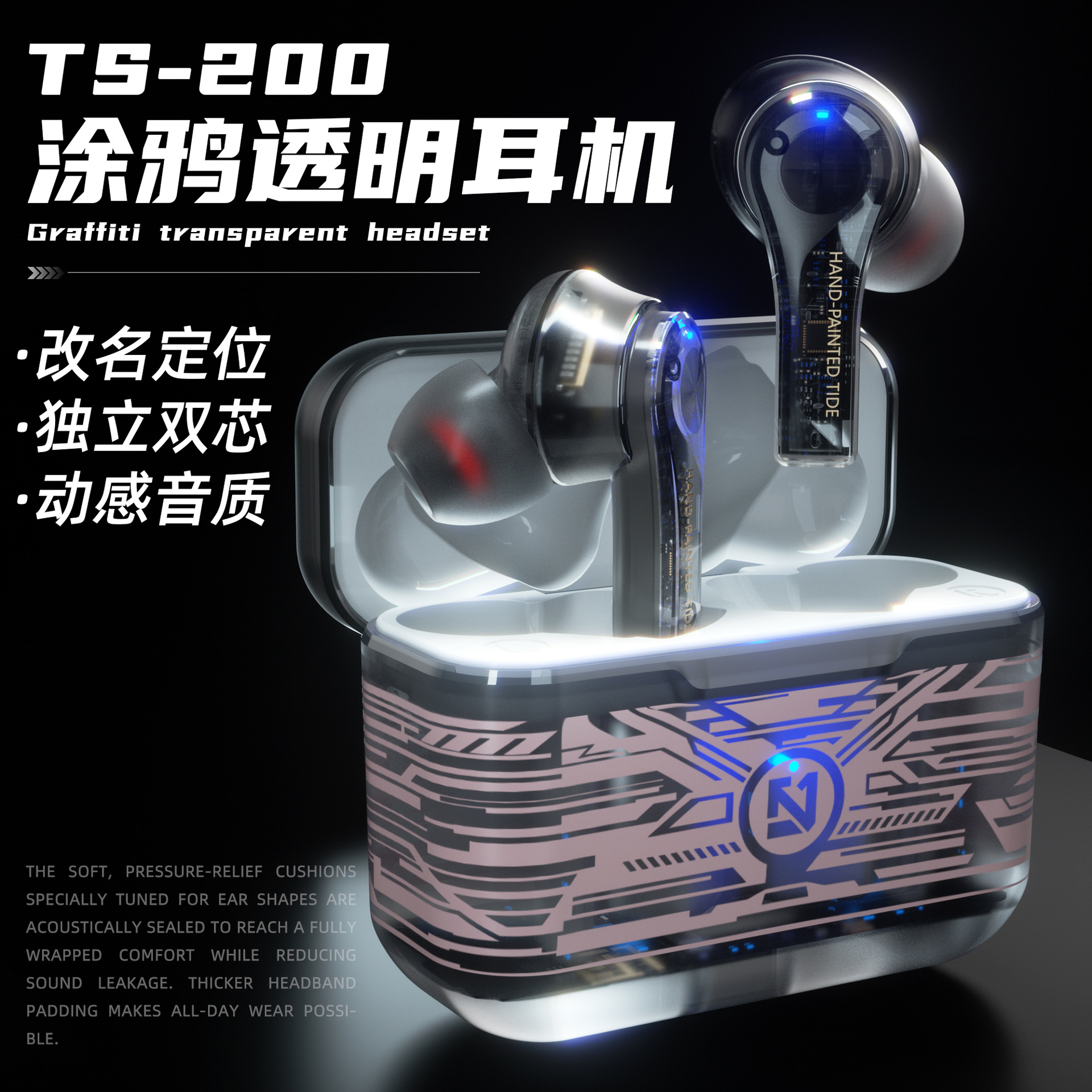 Cross-border headset Bluetooth olahraga nirkabel, headset model pribadi bahan transparan stereo TWS in-ear