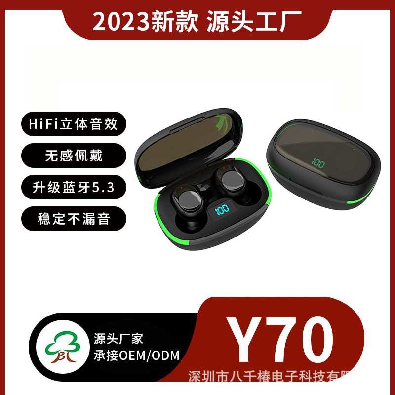 Headset Bluetooth Y70 populer dengan pengisian nirkabel model pribadi langsung dari pabrik tws mini dengan tampilan daya dengan lampu pernapasan
