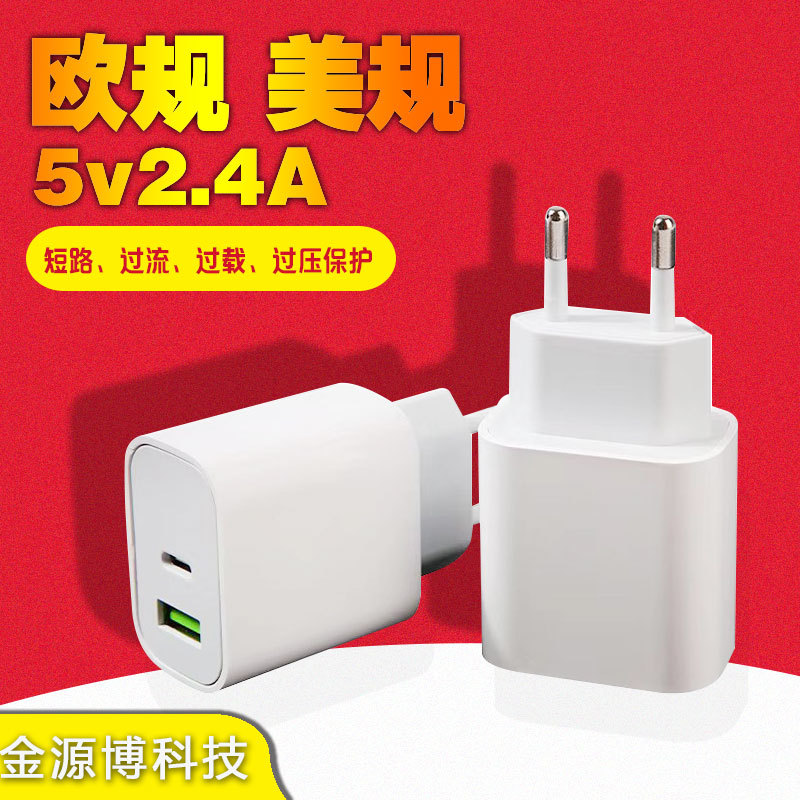 Kepala pengisi daya ponsel standar Eropa, pengisi daya kepala PD + USB Port ganda A + C pengisian cepat 5 v2,4 A