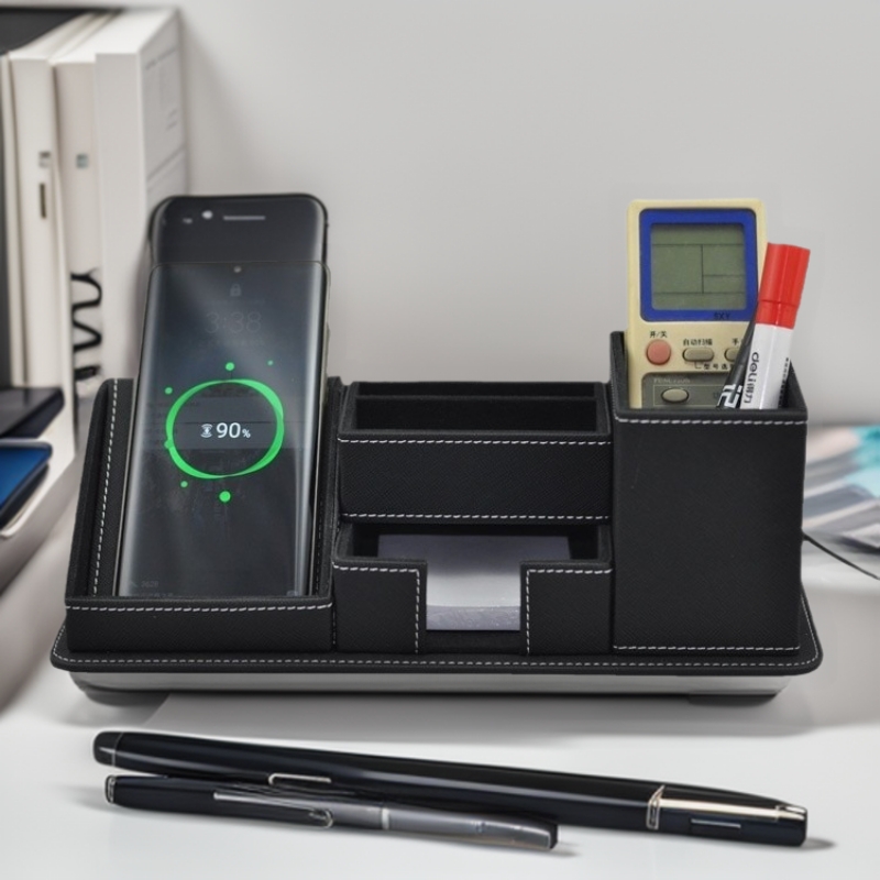 Hitam kulit kotak penyimpanan kantor pengisian daya nirkabel 10W ponsel pengisian cepat desktop kotak penyimpanan