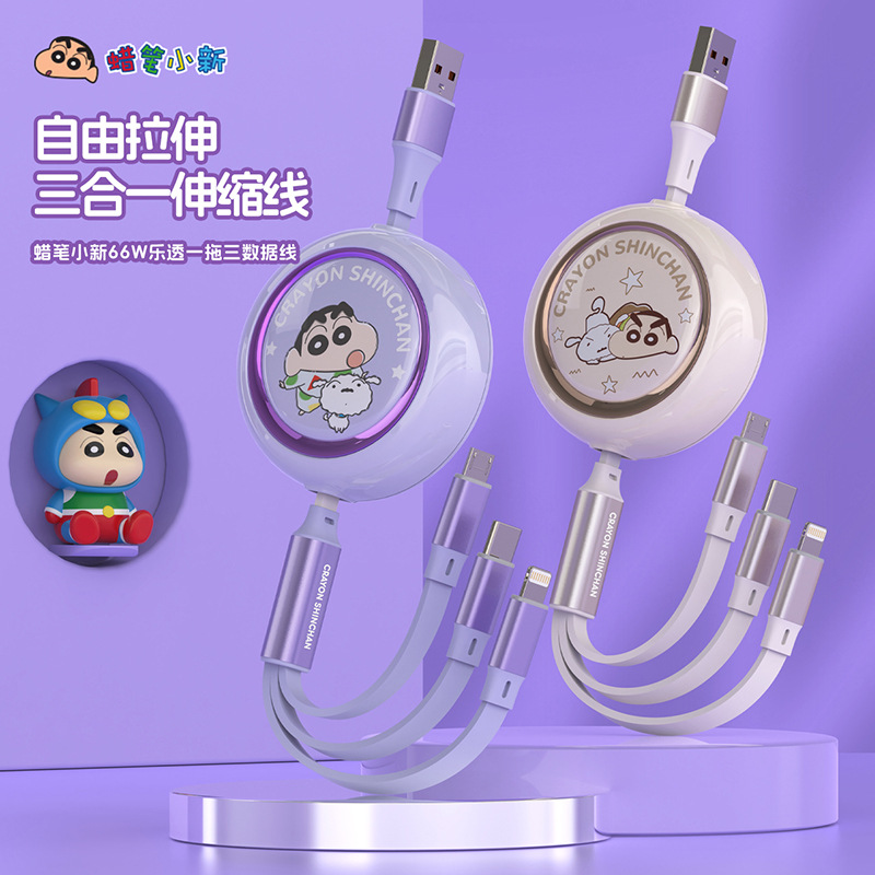 蜡笔小新一拖三数据线66W快充适用苹果华为安卓手机三合一伸缩线