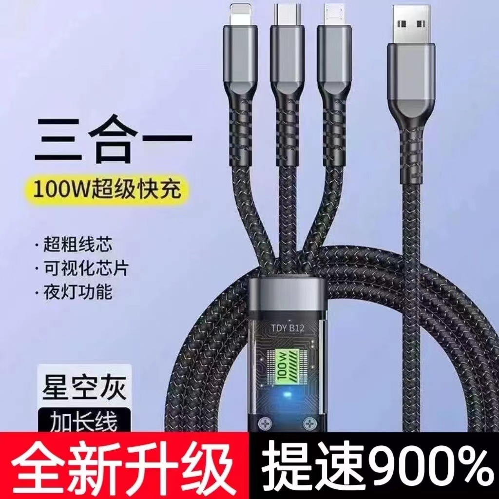 Transparan Kartu Super Cepat Isi ulang Satu Tarik Tiga Lampu Kabel Data 100W untuk Huawei Apple Android 3-in-1