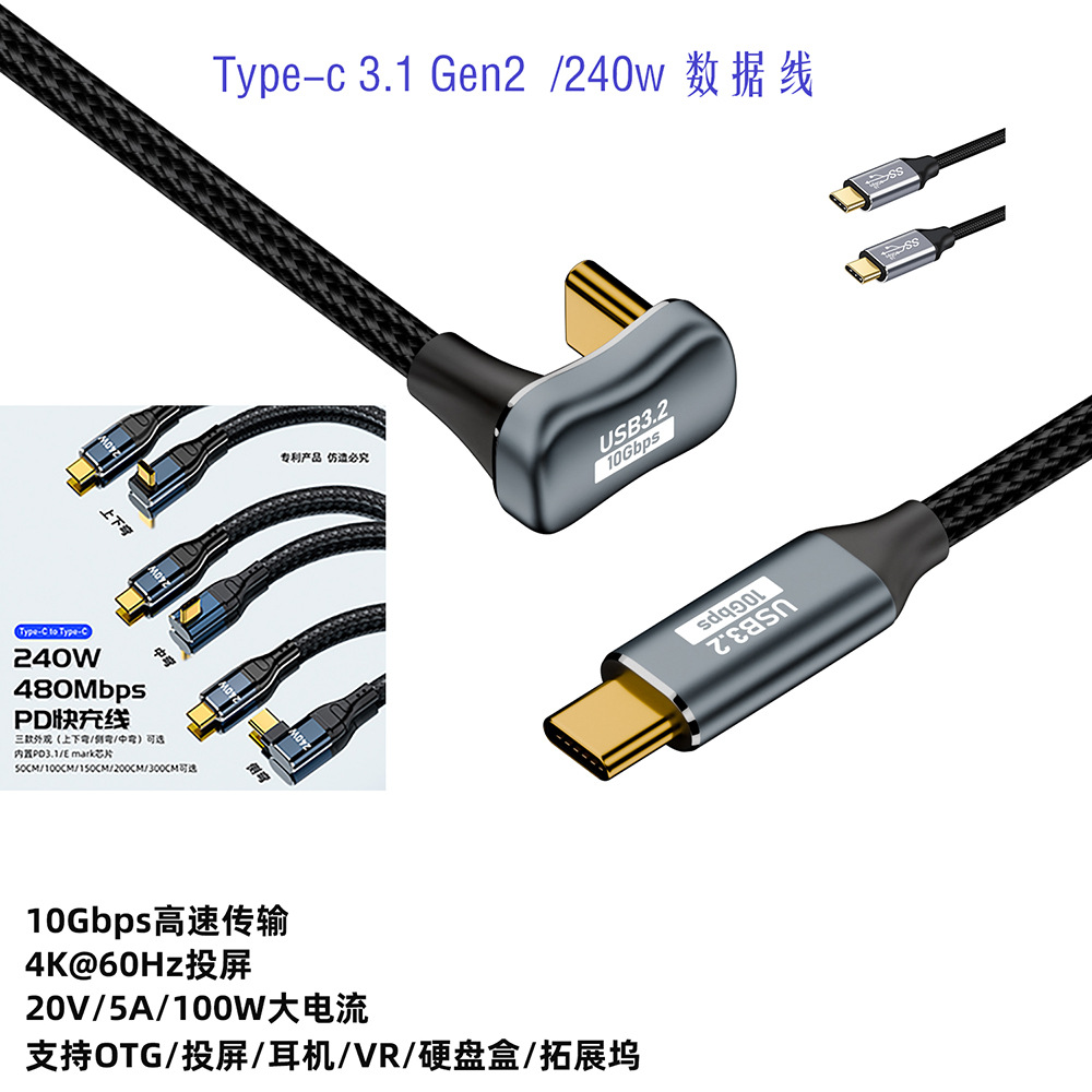 TypeC elbow kabel data game seluler, kabel pengisian daya Cepat fungsi penuh 10Gb240w, kabel data TV audio dan video HD