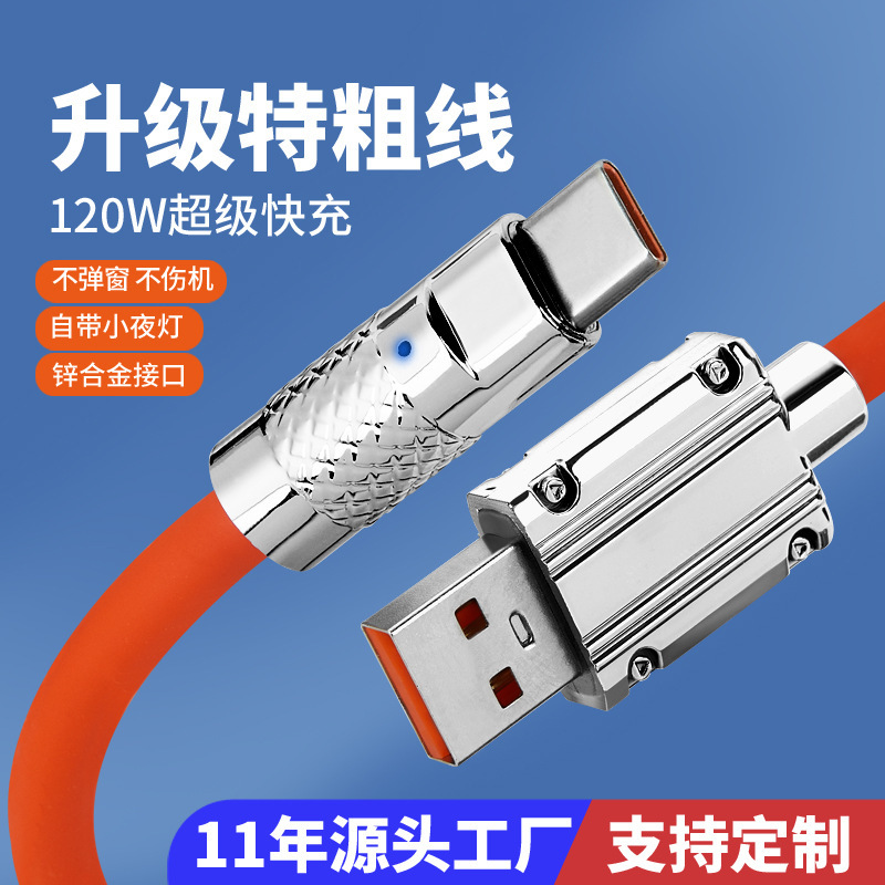 Kabel data bercahaya 6A 120W, kabel data isi daya tebal silikon cair jalur penumpang mesin Aloi seng pengisian cepat dengan tipe c
