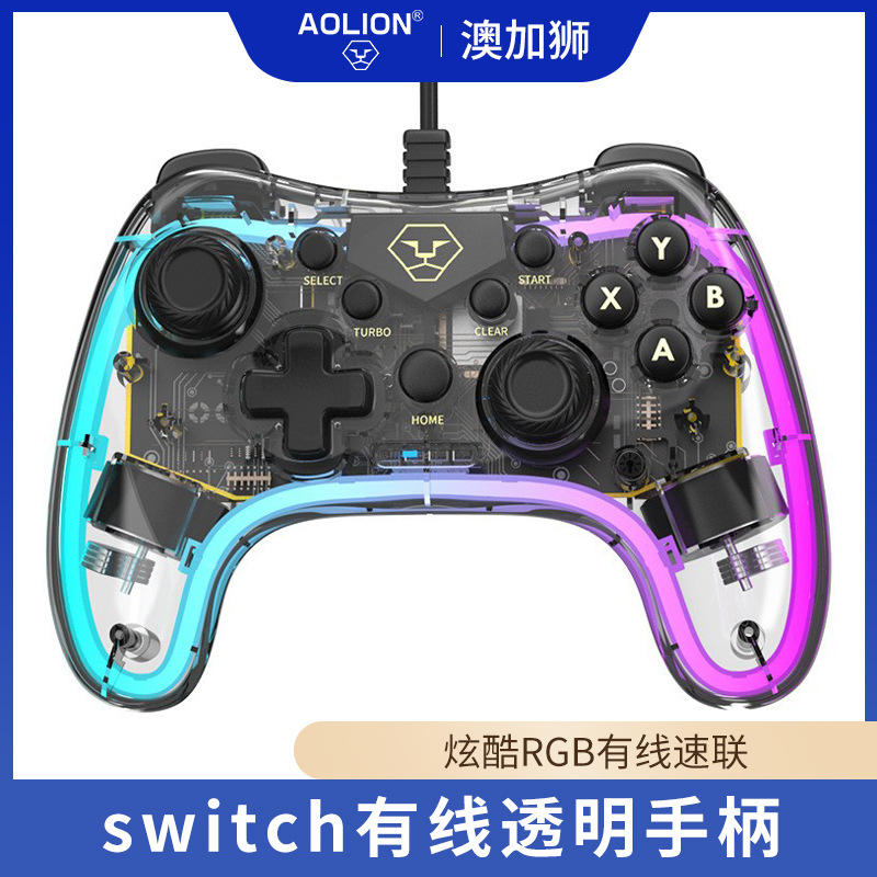 Switch gamepad berkabel transparan RGB, gamepad pro komputer PC ringan berkabel