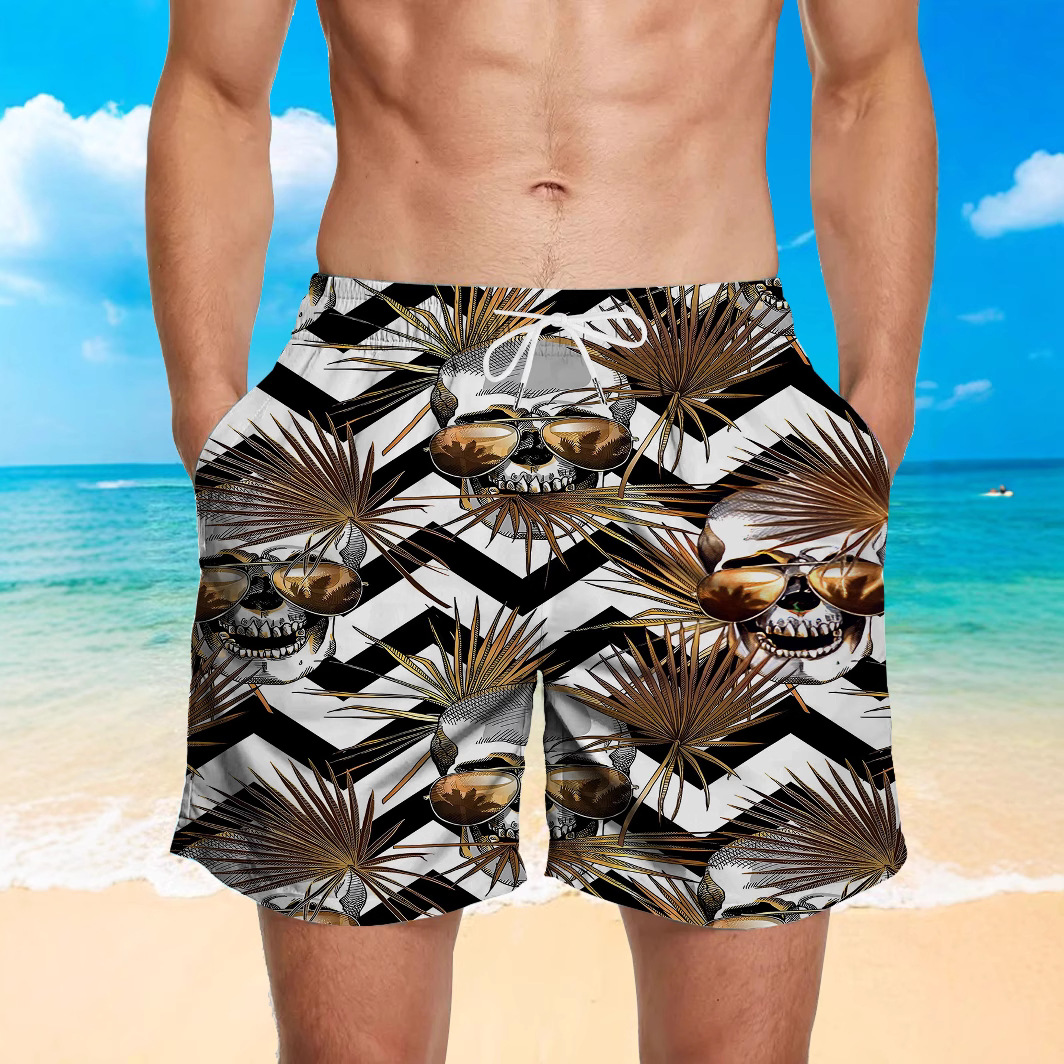 3D Digital Print Celana Renang Celana Pantai Skull, Kacamata Hitam, Celana Renang Profesional Longgar Model Baru Pria Daun Palem