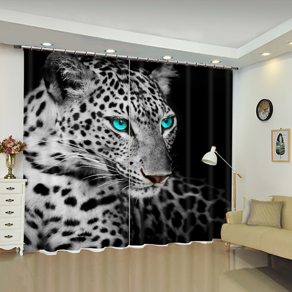 Tirai digital cetakan 3D, tirai kain busana jadi besar, motif 3D, tirai kepala macan tutul hitam, mata biru